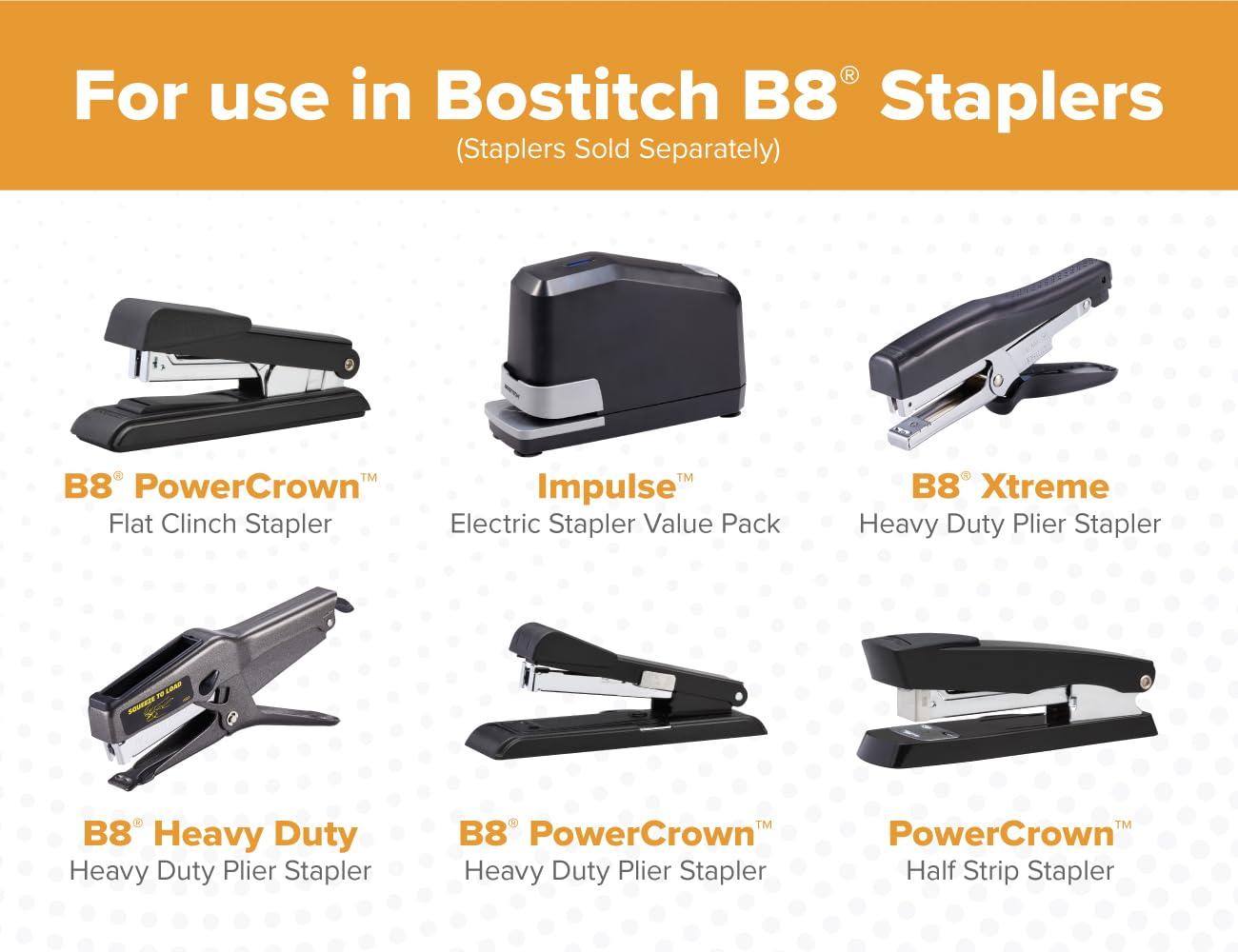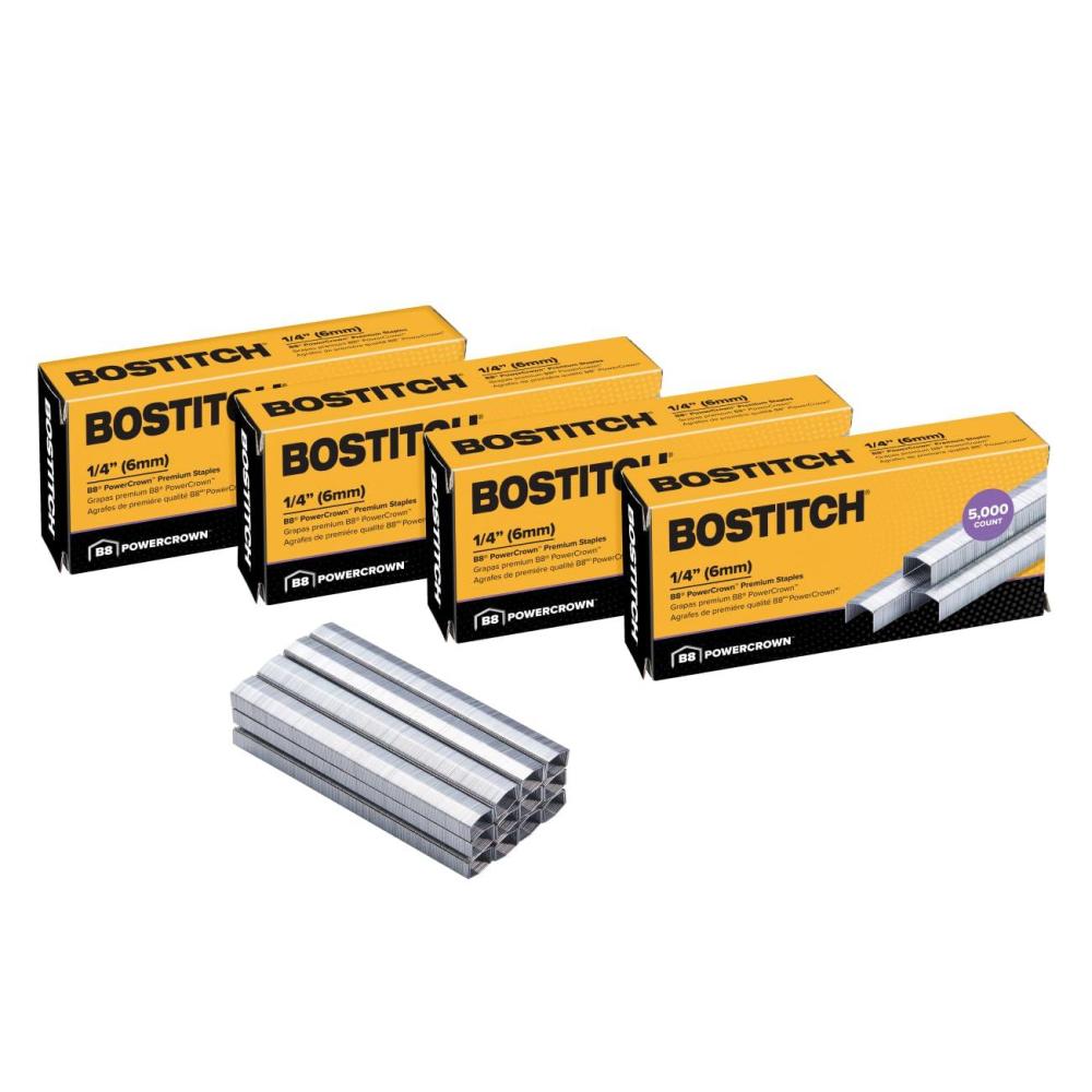 Legendary Bostitch B8 PowerCrown staples are crafted for ultimate drive performance. Taking the physical dynamics of staple driving into consideration led our engineers to develop the unique PowerCrown feature. As this crowned (peaked) staple top is flattened during the staple drive, it forces the staple legs outward so they are more fully supported by the stapler magazine throughout the drive. This delivers more stapling force and reduced buckling for maximum penetration. Each full strip contains 210 staples and is constructed from superior quality high carbon wire to reduce buckling and jamming. The finely honed chisel points deliver maximum penetration for maximum sheet capacity. ¼” leg length. 10,000 count.