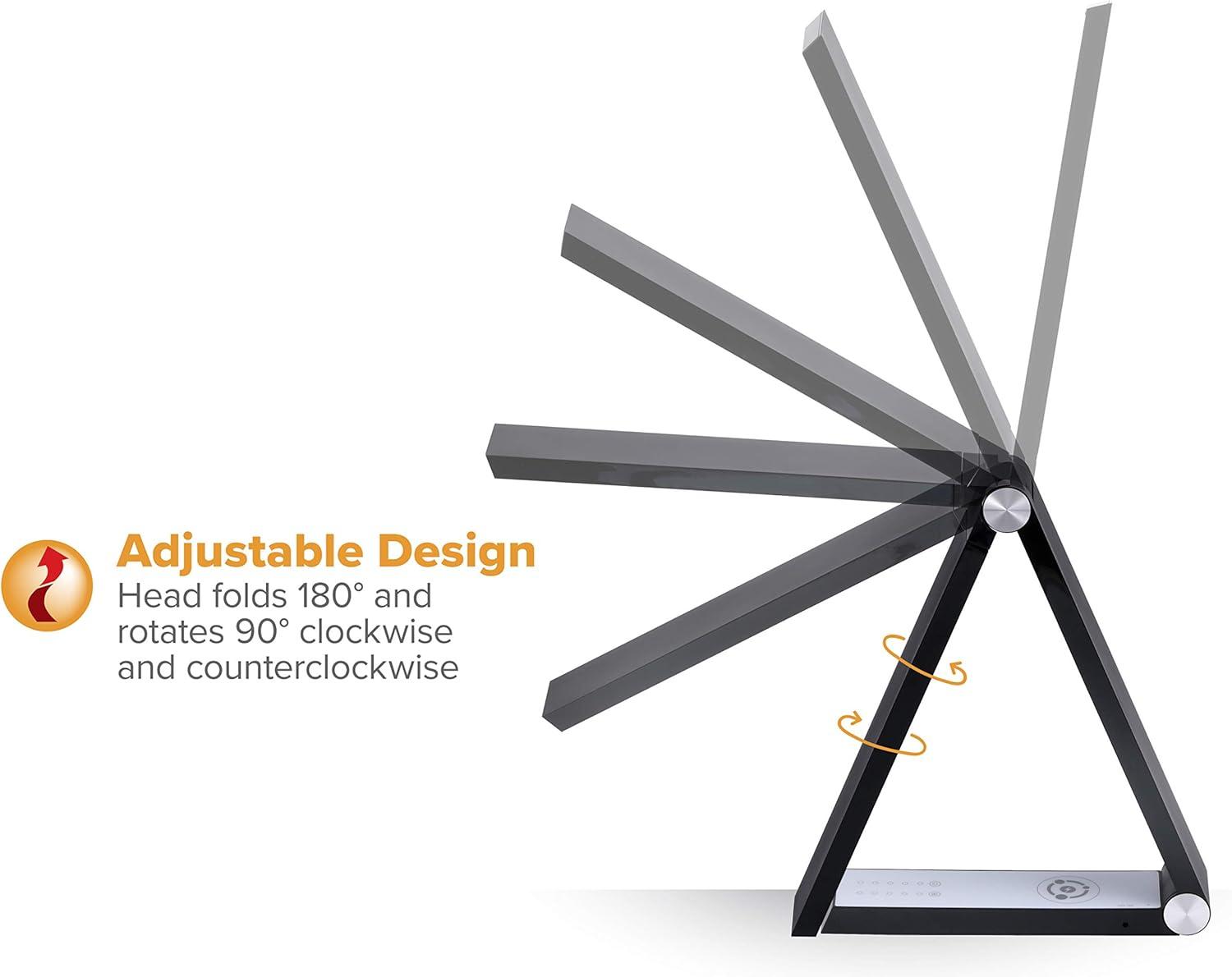 Swiveling lamp head folds 180º and rotates 90º for a modern, triangular accent light or standard task light