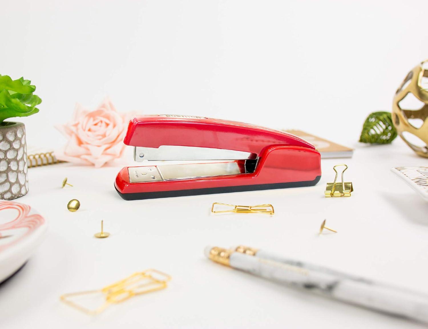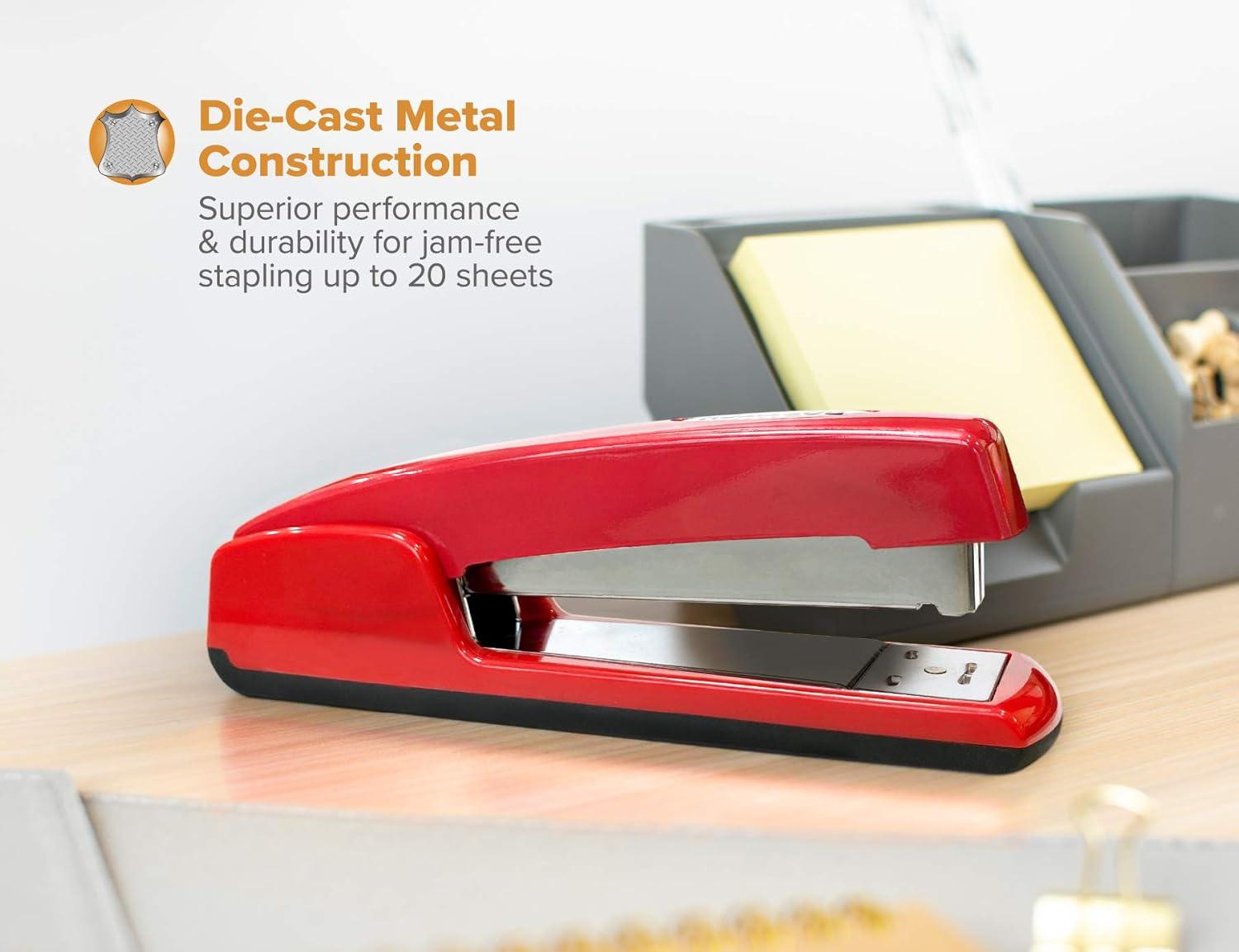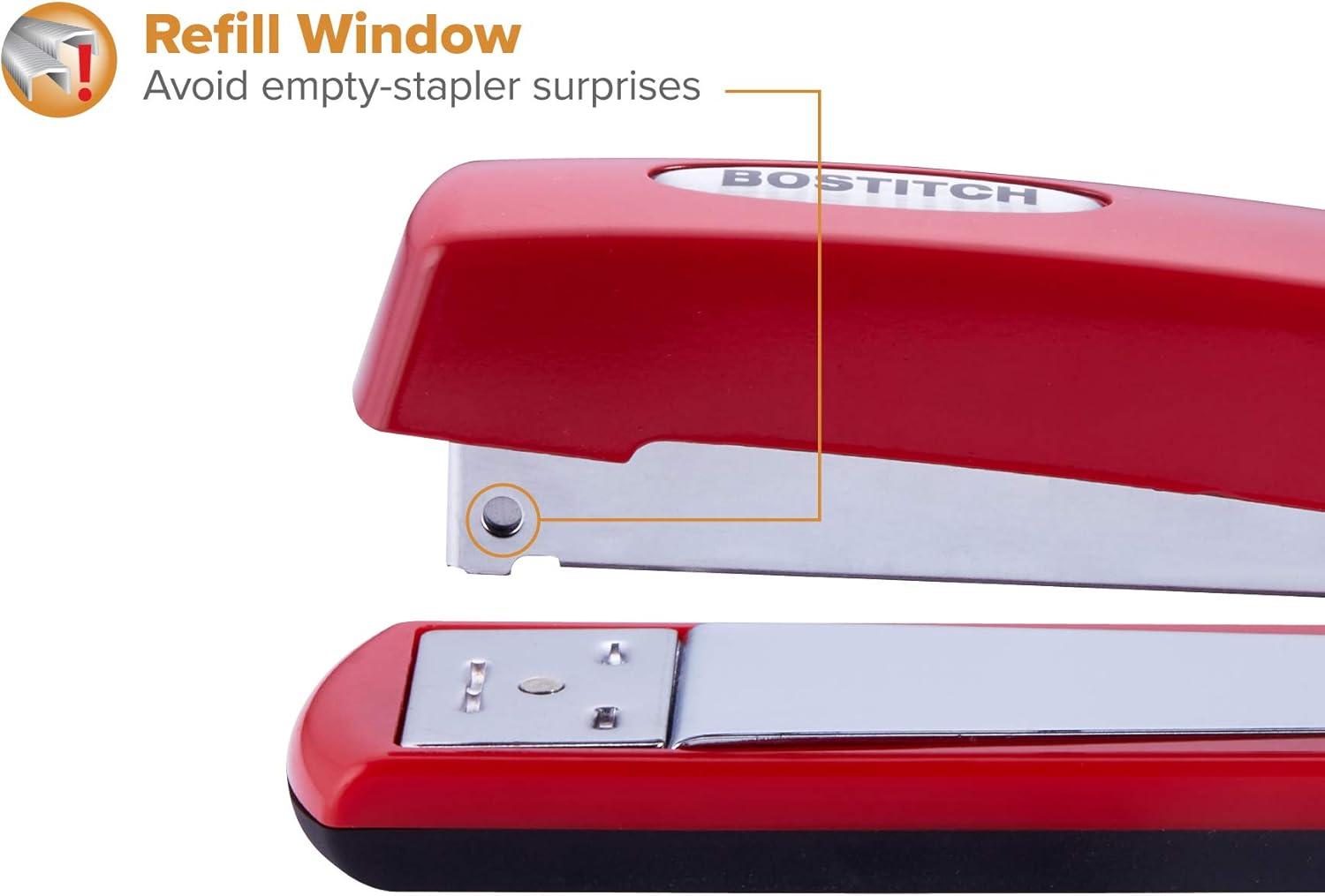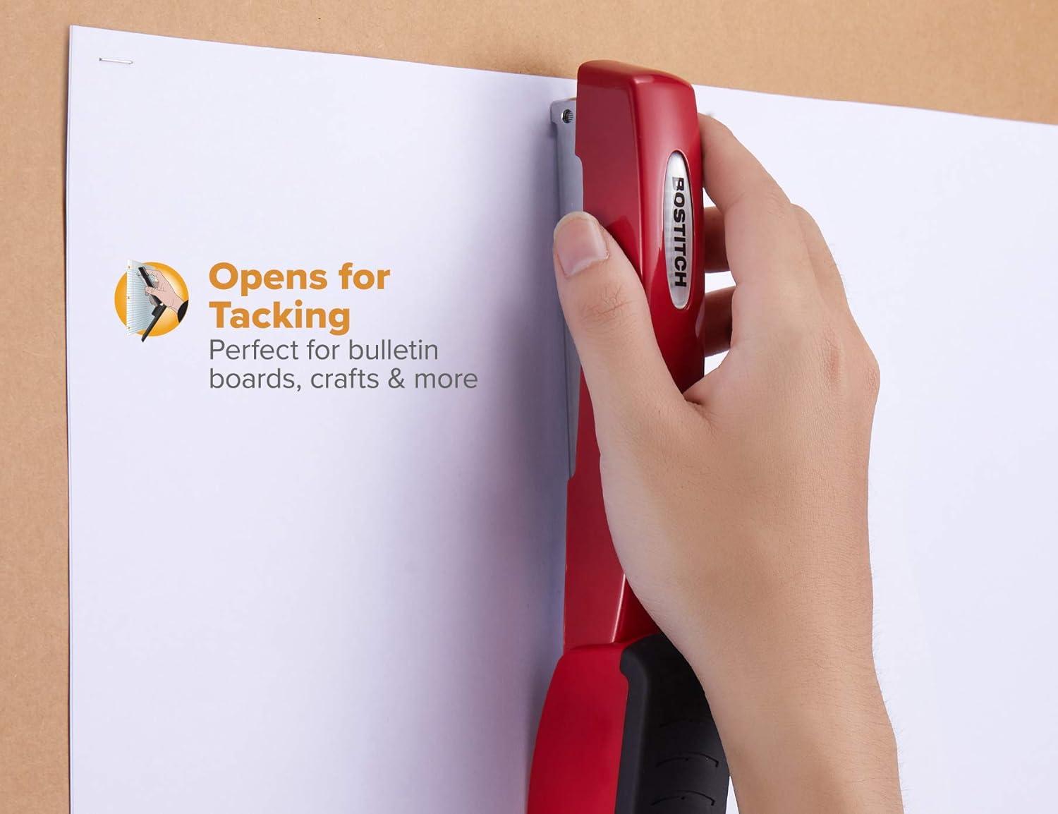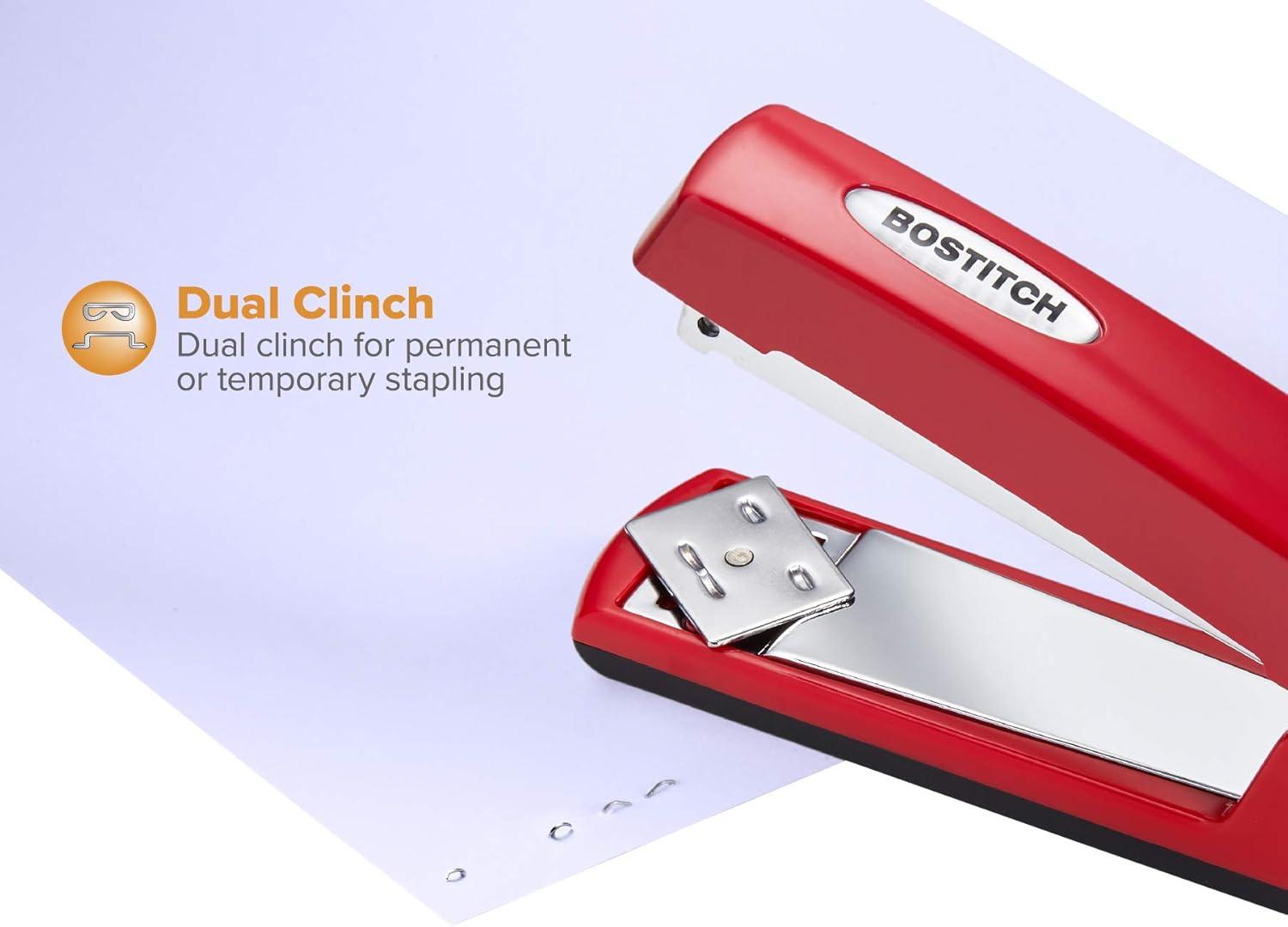 A combination of modern style, precision performance, and features make this Bostitch Classic Red Stapler ideally suited for any high volume office or home user. Featuring die-cast metal construction for superior quality and performance, it will easily and consistently staple up to 20 sheets. Our innovative No-Jam technology eliminates frustrating staple jams. For added convenience, it can be effortlessly opened to for bulletin board tacking and craft applications. The versatile Dual Clinch system easily adjusts with just a simple twist for either permanent or temporary stapling. So you are never caught by surprise, the staple refill window alerts you when it’s time to reload staples. It's trendy, durable and full of features, the perfect stapler for you!