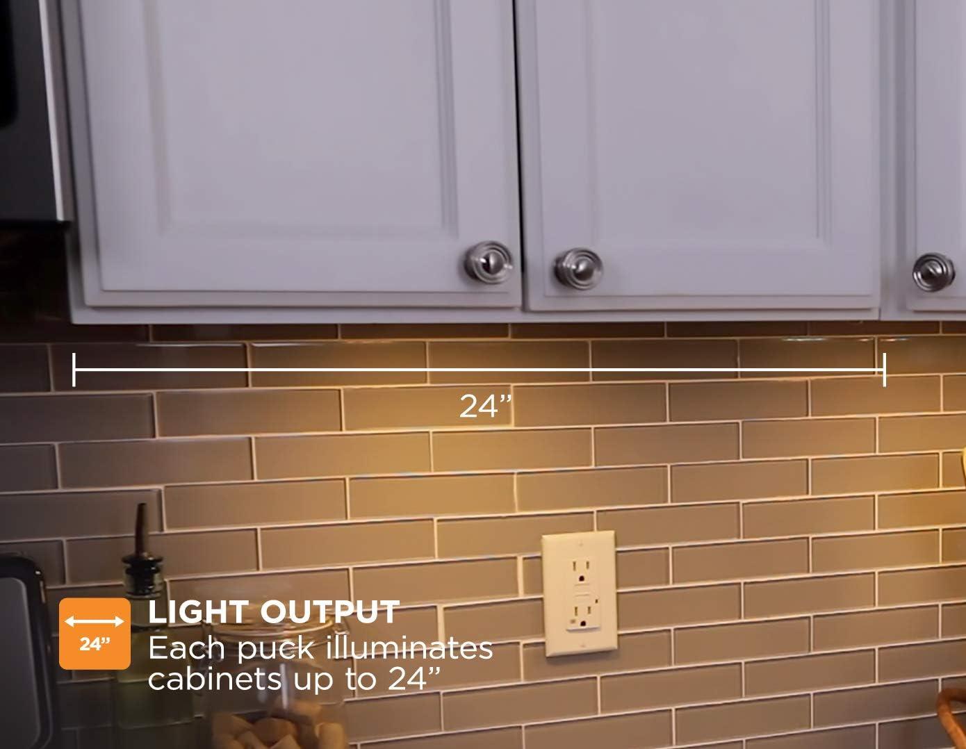 Radiate warmth throughout your kitchen with the BLACK+DECKER 7-Pack LED Puck Light Kit in warm white. The easiest under cabinet lighting to install for any homeowner, this kit requires no tools, no pros and only five minutes of your time! Linkable up to 7 lights, these puck lights shine bright at 910 lumens and 10. 5 watts. Dim and brighten as you see fit for any task with the hands-free motion sensor and 10 brightness levels. Purchase includes 7 puck lights, one 12W adapter, 7 screws and 32” tape strip. Also sold in cool white and color changing (LEDUC-PUCK-7RGBK). Add additional warm white lighting with an expansion light (LEDUC-PUCK-1W).